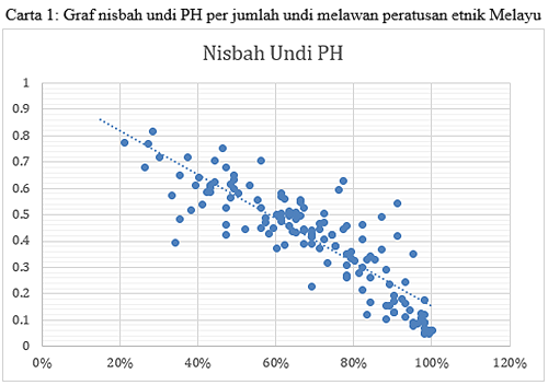 Carta 1 menunjukkan bahawa undi HARAPAN di Semenanjung Malaysia adalah berkadar songsang dengan peratusan etnik Melayu bagi satu-satu parlimen dengan nilai pekali m bersamaan - 0.83.