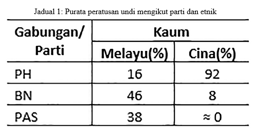 Jadual 1 adalah peratusan undi yang diperolehi mengikut etnik bagi Semenanjung Malaysia sahaja. Etnik India agar sukar didapati dengan tepat melalui teknik ini kerana taburannya tidak sekata.