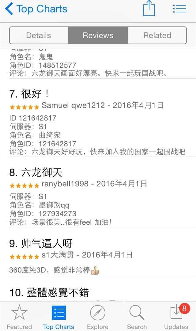 《六龙御天》的火爆程度在应用商店APP Store和Google Play的榜单上也可见一斑。众所周知,“畅销榜”排名是一款运用(游戏)综合热度的权威体现。《六龙御天》上线仅3天,就将排名提升至综合类应用第三名,并大有超越CR、COC的趋势,霸榜指日可待。值得一提的是,在应用商店的评论区看到玩家对这款游戏的体验评论也是盛赞不止。