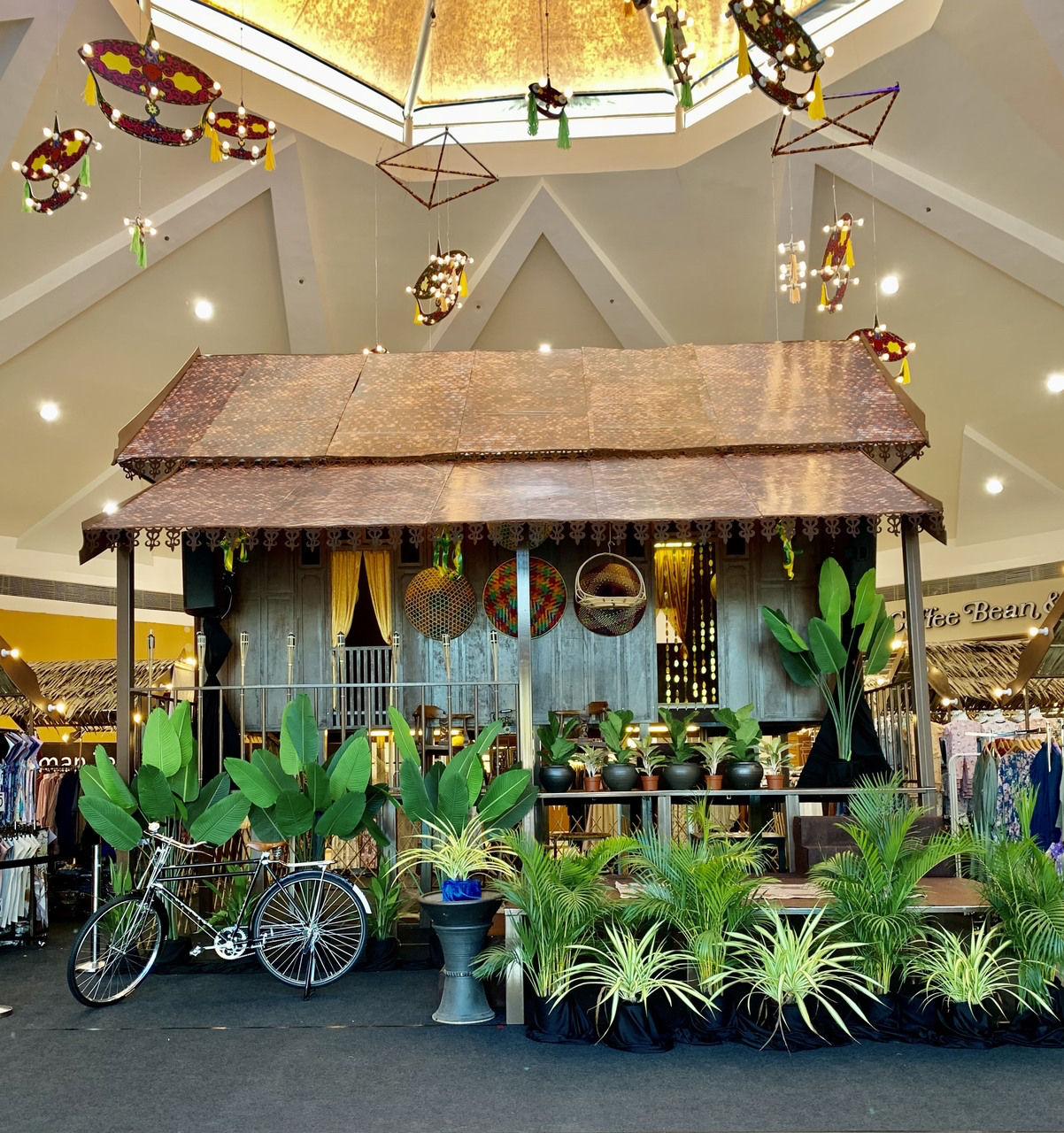 Rumah yang dihiasi dengan atap bermotifkan batik di seluruh ‘Centre Court’ pasti mampu membawa pengunjung ke era serba sederhana suatu ketika dahulu. Ditambah pula dengan dekorasi sampingan suasana kampung termasuk sangkar ayam, buaian dan pangkin. Di pangkin ini, para pelanggan boleh mencuba permainan tradisional yang disediakan seperti congkak, batu seremban dan lain-lain. Ruang yang dipagari keindahan cahaya pelita ini juga pasti dapat membangkitkan keseronokan menyambut perayaan kali ini, di samping menjadi latar belakang yang menarik untuk sesi fotografi terutama muatnaik di media sosial.