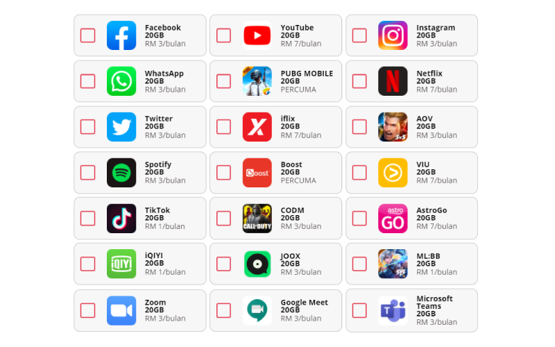 Sekiranya anda ingin membuat penambahan data khusus 20GB berdasarkan penggunaan aplikasi-aplikasi tertentu, anda boleh jimat sehingga 40% dengan Add-on untuk pelbagai aplikasi penstriman video, permainan dalam talian atau media sosial seperti Instagram, Spotify, Twitter, dan banyak lagi dari harga serendah RM3.