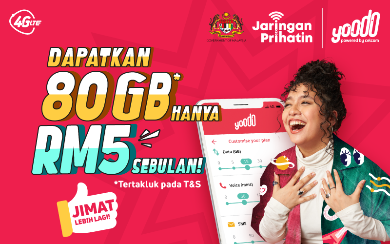 Penjimatan hebat dapat diperolehi dengan tawaran Jaringan Prihatin Yoodo. Pengguna yang layak dapat menikmati 80GB data berkelajuan tinggi dengan hanya RM5 sebulan, berturut-turut selama 12 bulan!
