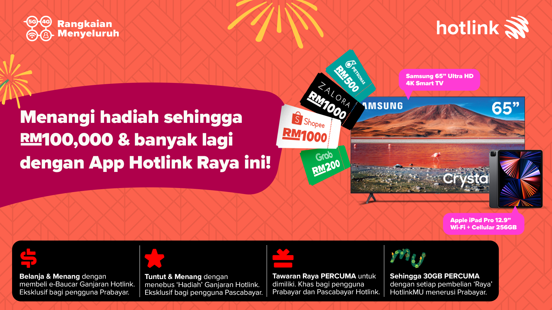 Tawaran Raya PERCUMA, serta kempen Belanja & Menang dan Tuntut & Menang akan berlangsung sehingga 7 Mei. Lawati https://www.hotlink.com.my/en/lifestyle/rewards/ untuk mengetahui cara menikmati tawaran yang tersedia.