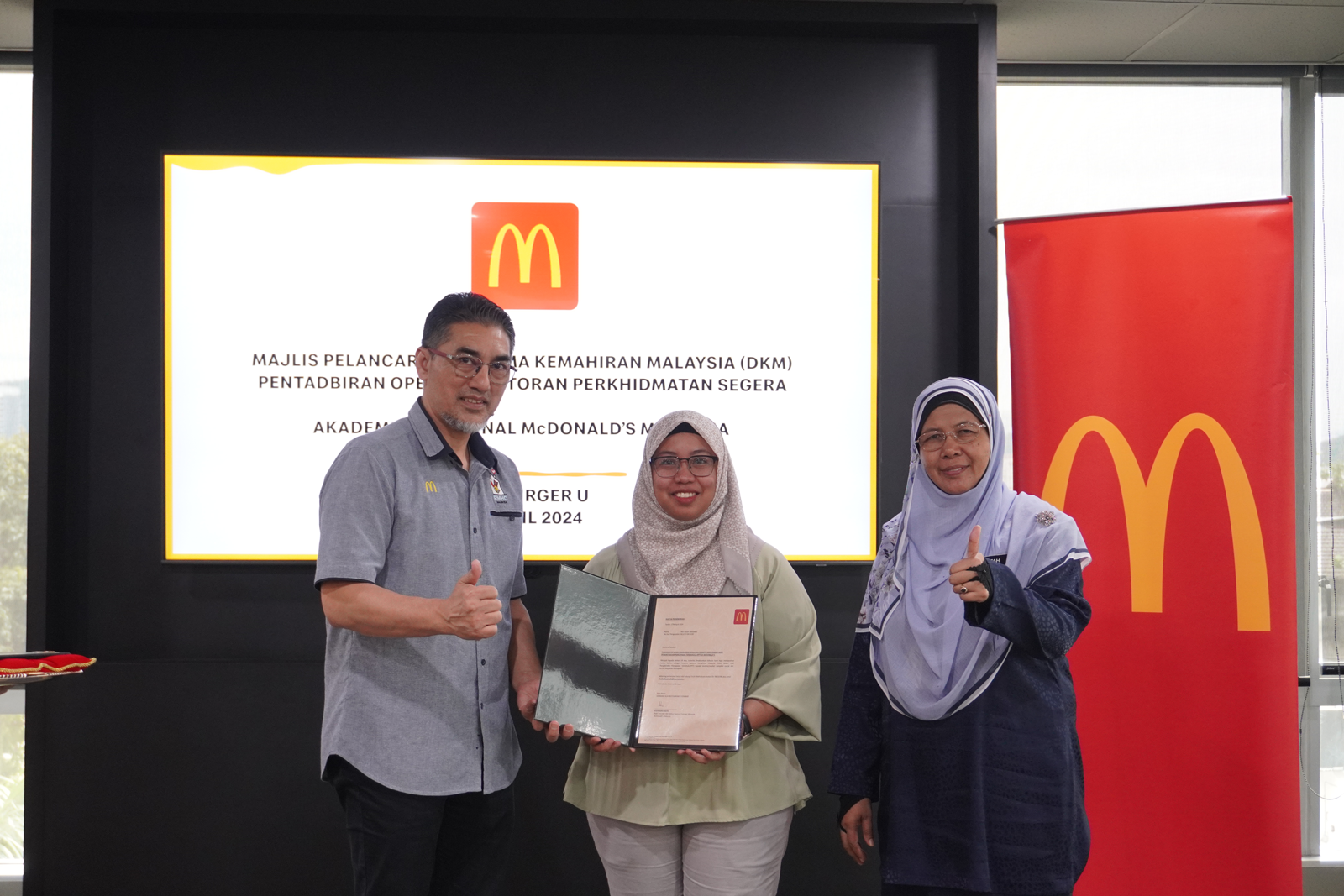 McDonald's Malaysia buat julung kalinya menawarkan Diploma Kemahiran Malaysia (DKM) Tahap 4, dalam bidang restoran perkhidmatan segera kepada 20 graduan menerusi Program Perantis Vokasional McDonald's Malaysia.