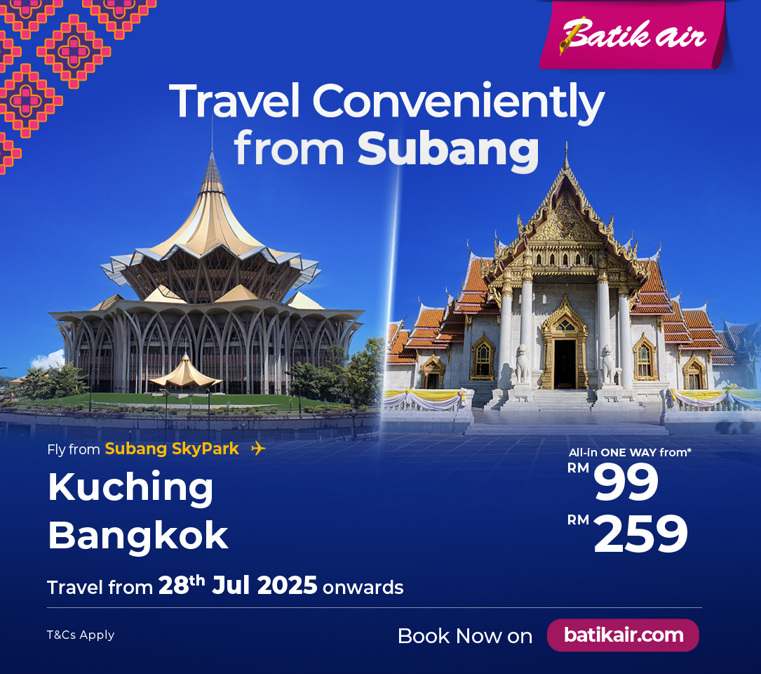 Batik Air will operate daily flights to Bangkok Don Mueang International Airport (DMK), marking a momentous milestone in the airline’s growth and in the revival of Subang as a key aviation gateway. On the same date, Batik Air will also commence daily flights to Kuching International Airport (KCH), further strengthening domestic connectivity from Subang.