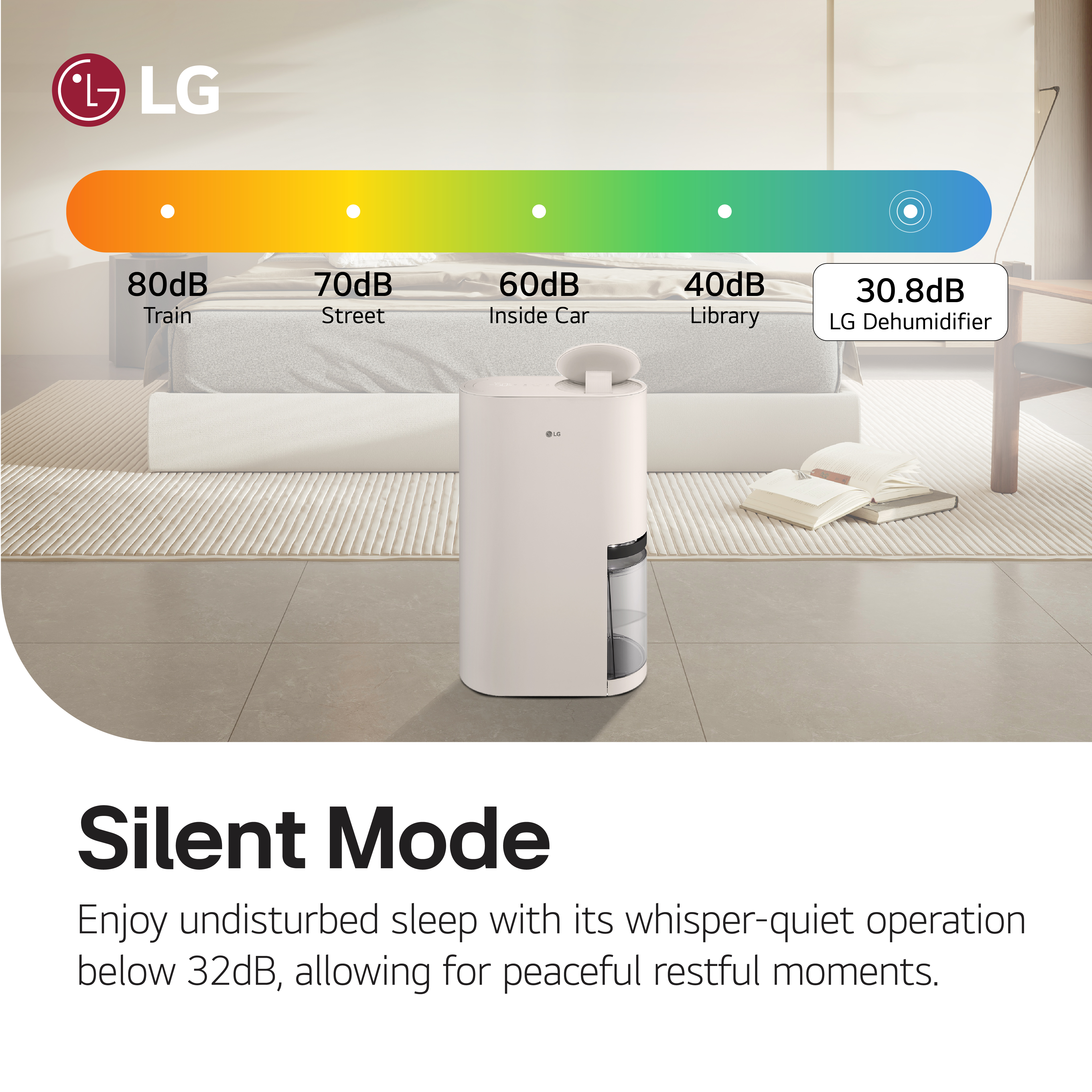 To cater to the diverse needs of modern living, the LG PuriCare™ DUAL Inverter Dehumidifier offers four dedicated operating modes. Smart+ Mode intelligently senses and adjusts to changing humidity levels, maintaining the desired indoor humidity within the ideal range of 30%–60% for fresh, balanced, and consistent comfort all day long. Silent Mode runs at whisper‑quiet levels below 32dB, making it ideal for bedrooms, nurseries and study areas where a calm atmosphere is essential.