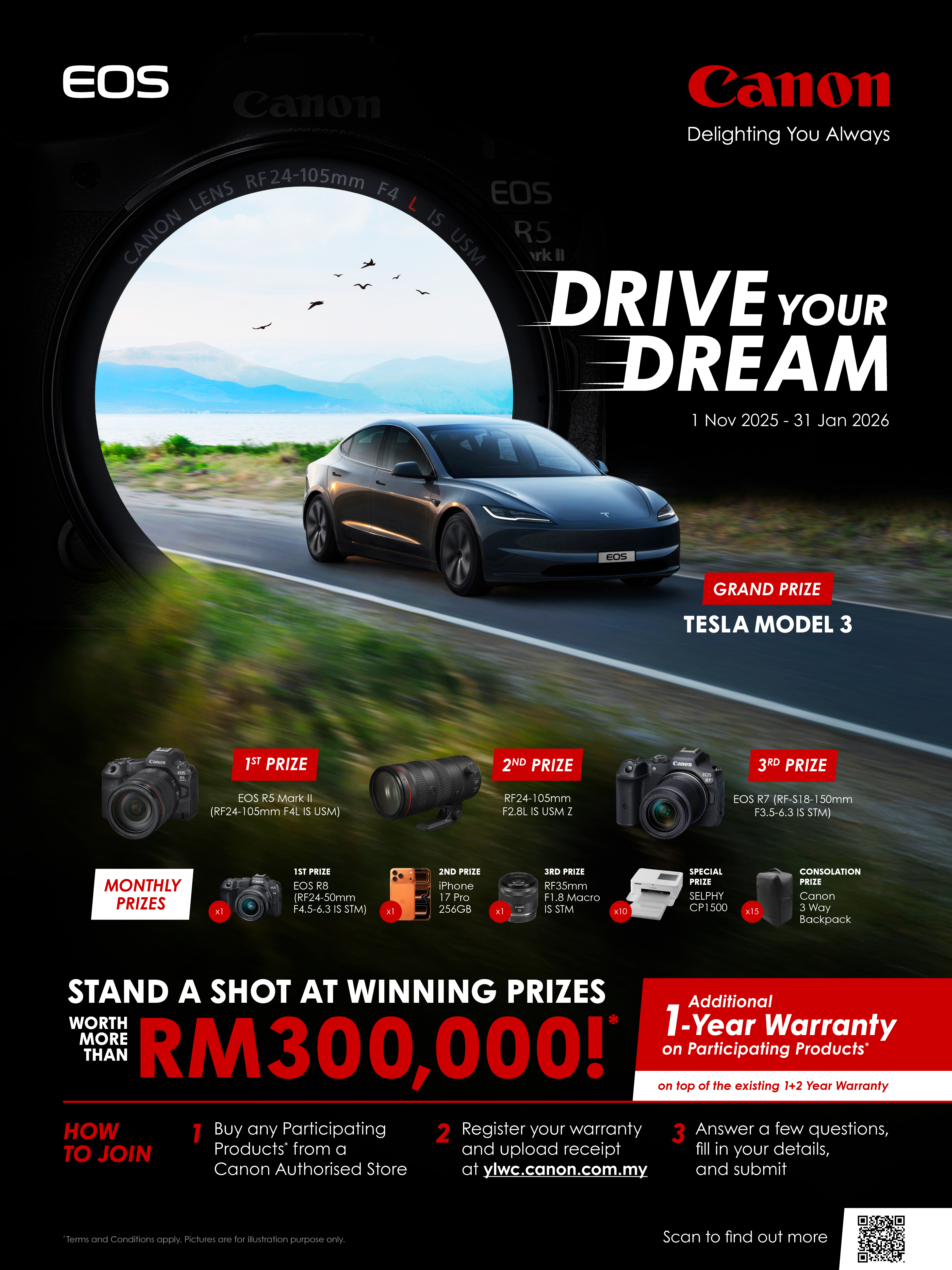 “The ‘Canon Drive Your Dream’ campaign is designed to do more than reward our customers — it strengthens our commitment to making quality imaging products even more accessible during the peak year-end season. By offering premium prizes, including the Tesla Model 3, and extending our warranty coverage, we aim to give Malaysians greater confidence and value with every Canon purchase. This campaign also supports our retail partners by driving footfall and encouraging customers to upgrade their gear, ultimately inspiring more people to explore the joy of photography,” said Edward Chang, Head of Image Communication Business Division, Canon Marketing Malaysia.