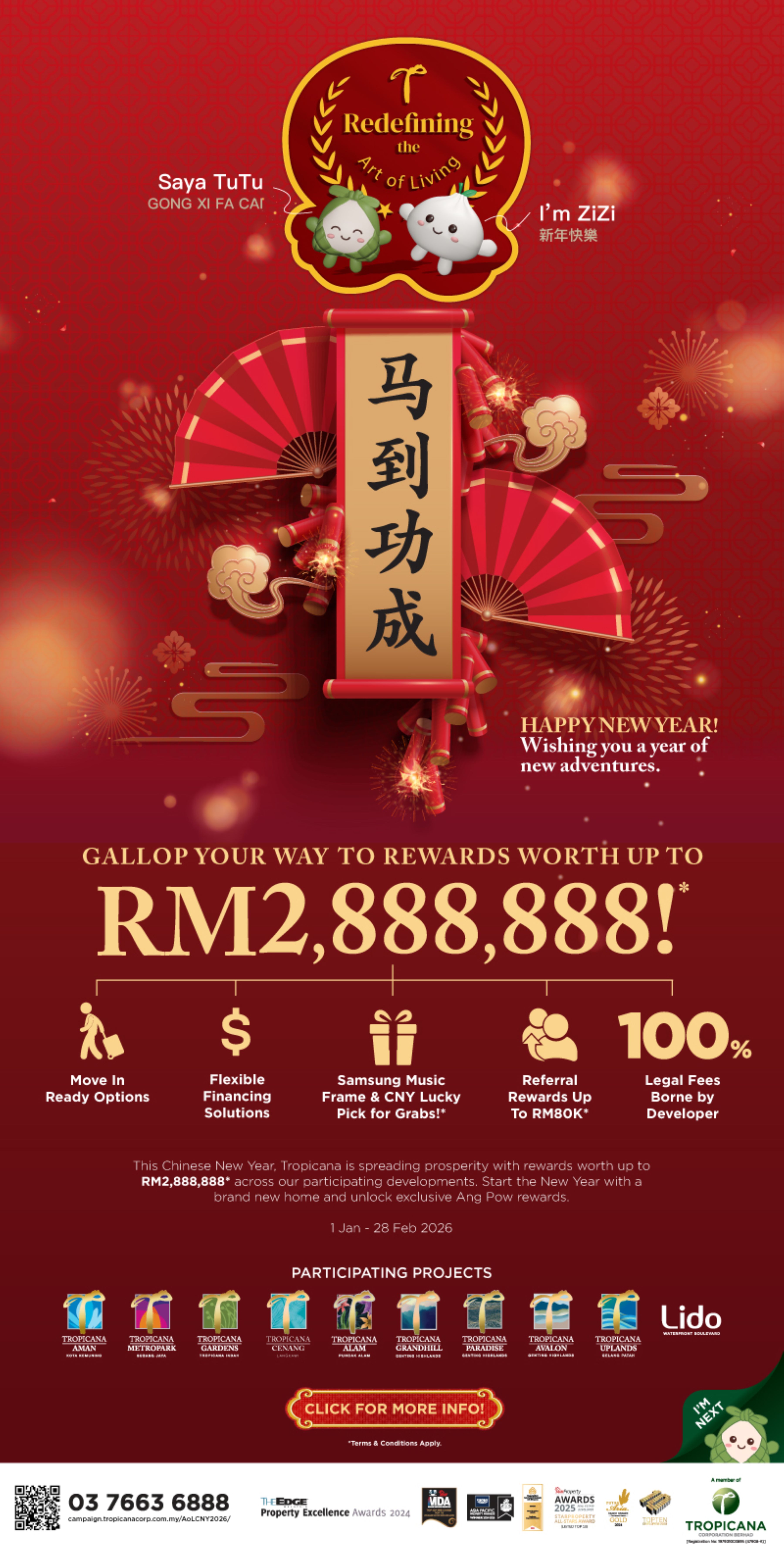 Ixora Ang, Managing Director of Marketing & Sales and Business Development for Tropicana, elaborated on the festive effort, sharing, “Galloping into the Year of the Horse, Tropicana continues its commitment to connecting communities and forging futures. As part of this Chinese New Year campaign, customers can enjoy attractive financing solutions via Maybank MyDeco, and through the Easy Payment Scheme, alongside full absorption of legal fees and stamp duties by Tropicana. The campaign also offers referral rewards of up to RM80,000.”