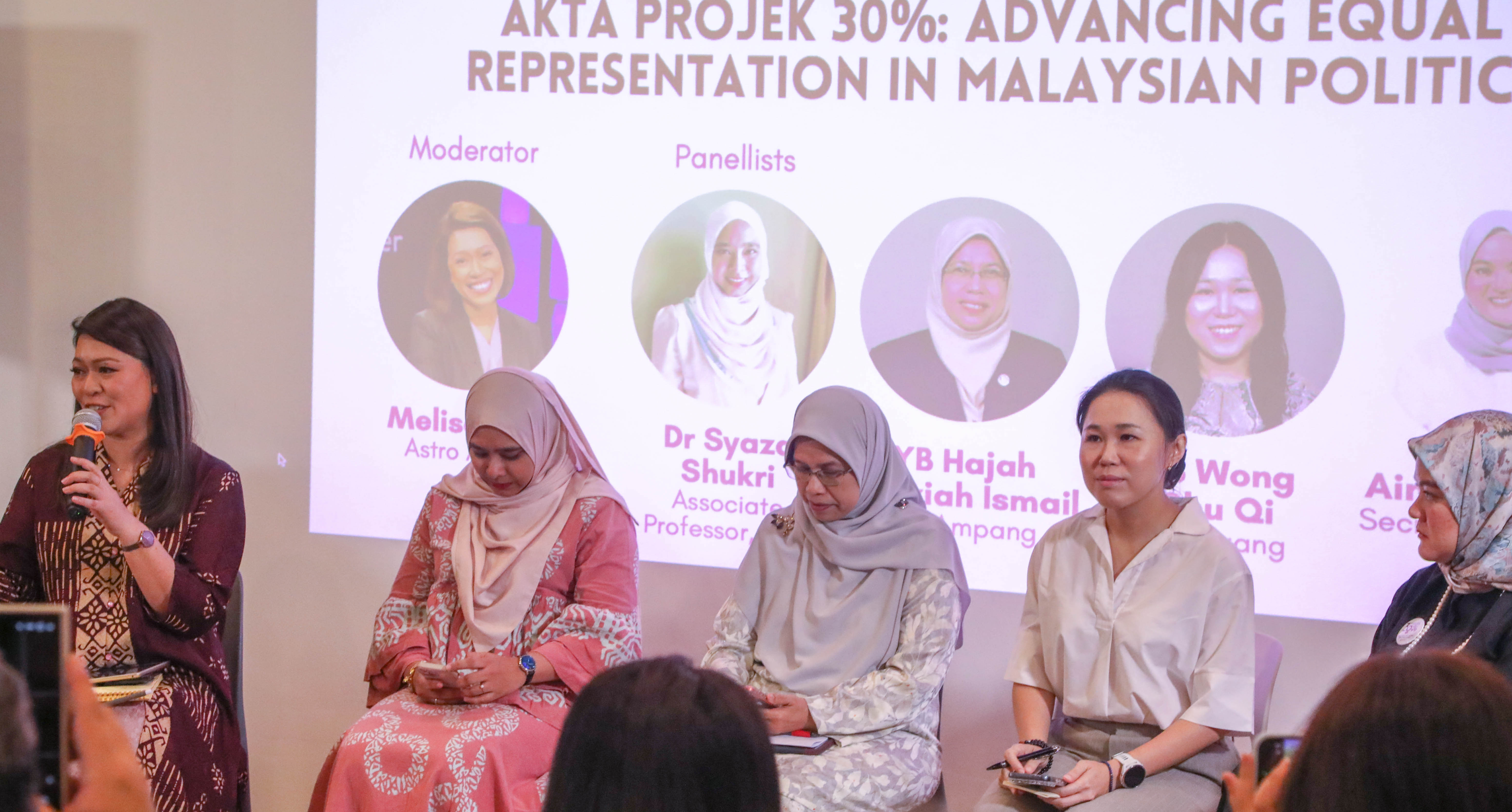 The forum titled ‘Akta Projek 30%: Advancing Equal Representation in Malaysian Politics’ featured a panel discussion with YB Hajah Rodziah Ismail (MP Ampang), YB Wong Shu Qi (MP Kluang), Dr. Syaza Shukri (Associate Professor at IIUM), and Ainie Haziqah (Secretary General of MUDA), and was moderated by Melisa Idris of Astro Awani. The discussion centred around the urgency of legislative reform and the pathway toward equal political representation.