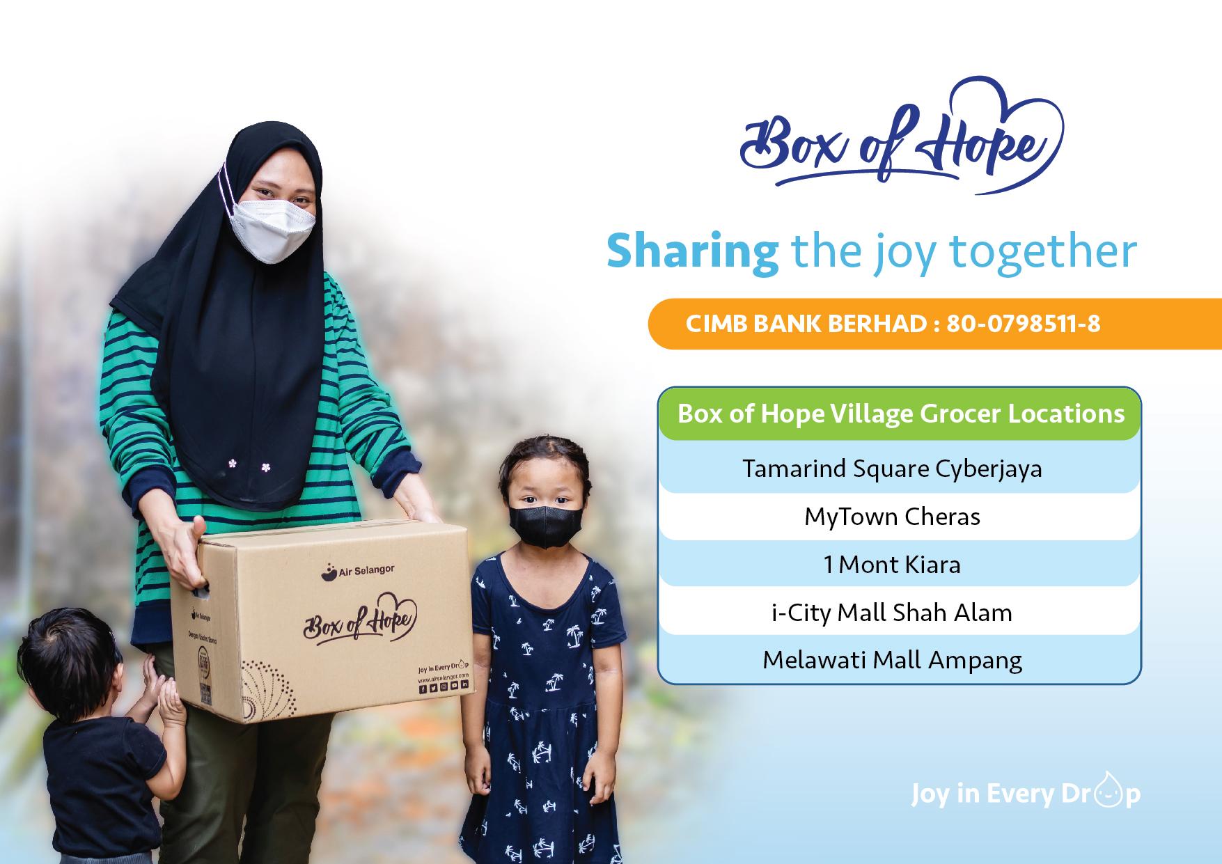 The public can still make physical donations at the existing five Box of Hope Village Grocer locations – namely Tamarind Square Cyberjaya, MyTown Cheras, 1 Mont Kiara, I-City Mall Shah Alam, and Melawati Mall Ampang. Air Selangor also plans to increase the number of Box of Hope distribution centres at Village Grocer outlets for the convenience of the public to make their donations. Box of Hope contributions can also be channelled through the CIMB bank account 80-0798511-8 (do include “Box of Hope Initiative Assistance” as a note).