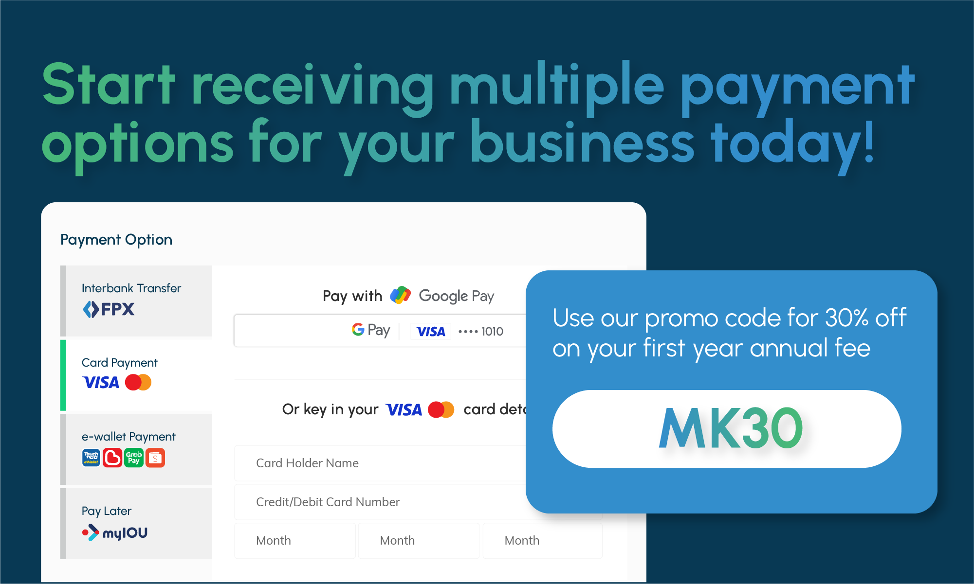 Enjoy a 30% off when you activate a SenangPay account (promo code: MK30). Don’t miss the opportunity to seamlessly accept online payments today!