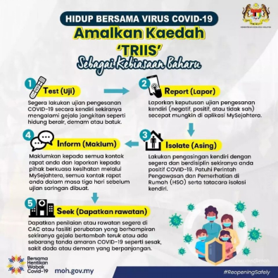 Orang ramai dinasihatkan agar terus mematuhi saranan dan nasihat kesihatan termasuk amalkan TRIIS (Test, Report, Isolate, Inform, and, Seek) sebelum menghadiri aktiviti sosial atau jika bergejala dan dapatkan ujian COVID-19 dengan segera jika mereka mempunyai simptom¹⁰.