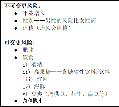 引发痛风的风险分为两类:可变更风险(能够控制或改变)和不可变更风险(无法改变)。