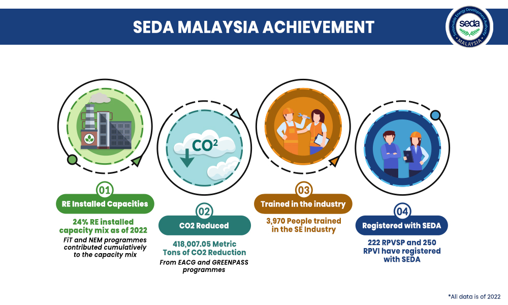 In carrying out our role mandated by the Government, SEDA Malaysia has implemented several SE programmes for both the Renewable Energy (RE) and Energy Efficient (EE) aspects. The recent Energy Transition Index by the World Economy Forum (WEF) saw Malaysia ranked 39th, the highest amongst all the Southeast Asian countries, with system performance and transition readiness at 69% and 60% respectively. This is indeed good news which shows Malaysia is in the right track in managing a safe, affordable and just energy transition. The success indicates strong collaborations between the Ministry, SEDA Malaysia, and various stakeholders in realising the nation’s goal towards a sustainable country.