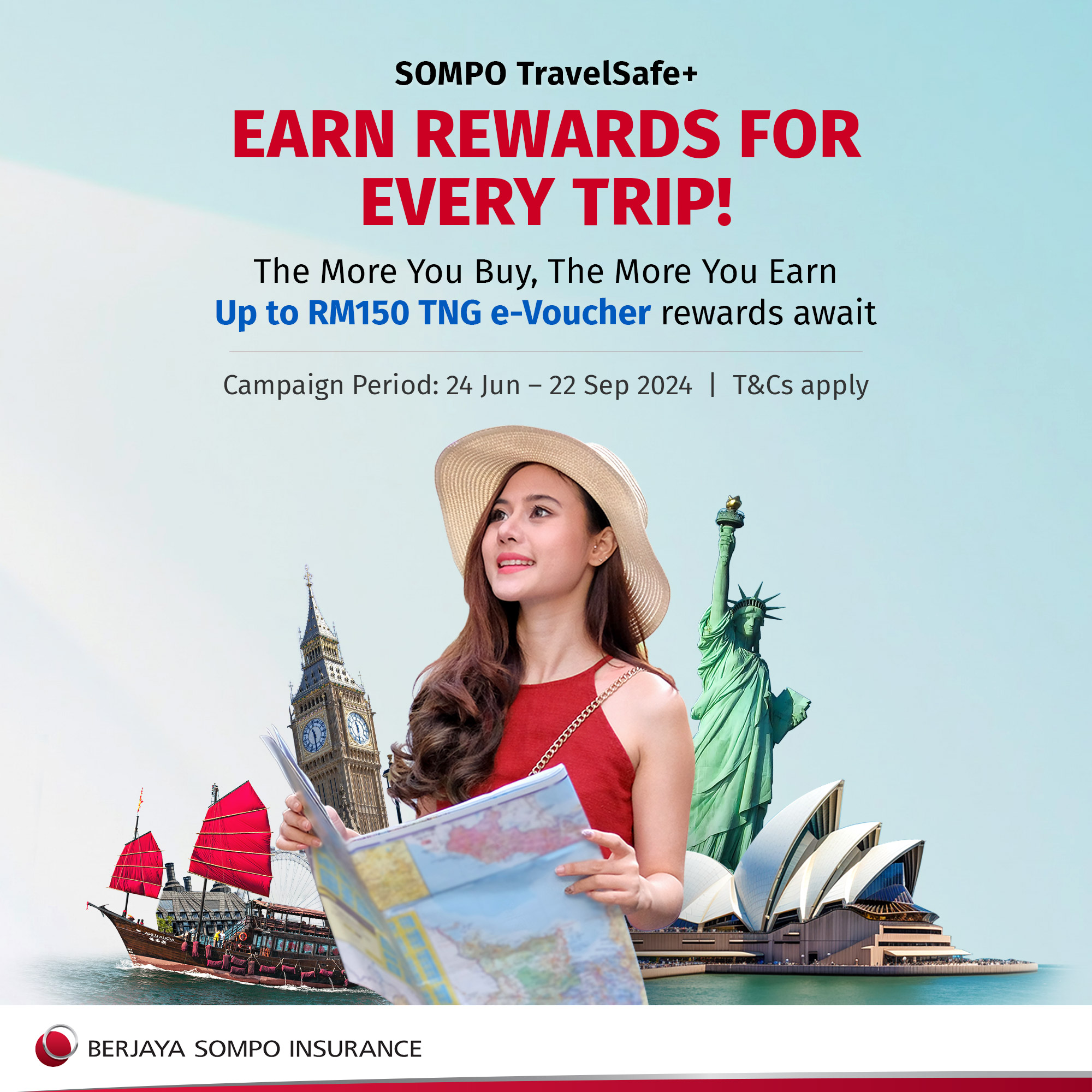 Earn up to RM150 in TNG e-Voucher with SOMPO Earn Rewards For Every Trip Campaign until 22 September 2024.