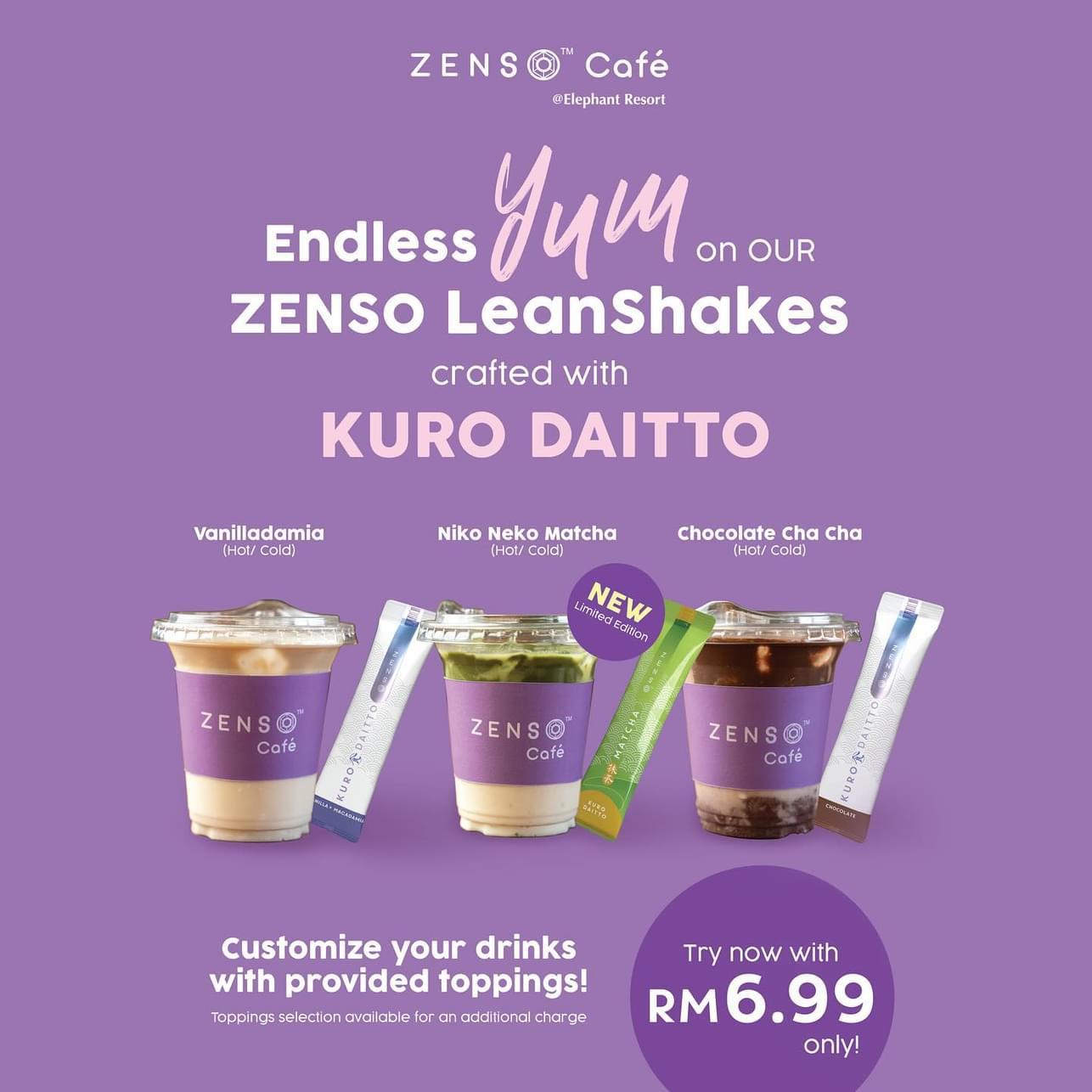 ZENSO Purple Café推出了ZENSO LeanShakes(低卡SO奶昔)Vanilladamia(香草夏威夷)、Chocolate Cha Cha(丝滑可可)以及Niko Neko Matcha(和风抹茶)。这三款低卡SO奶昔采用了KURO DAITTO低卡轻食,成分中含有Slimaluma仙人掌提取物,与非洲猴面包树果粉、纤维植脂末、大豆分离蛋白、乳清蛋白分离物、中链甘油三酯油粉、魔芋粉以及综合维生素矿物质等7大天然成分,能够补充每日营养需求、增加饱腹感,同时又低卡路里。特别值得一提的是,顾客仅需以6令吉99仙的特价就可以轻松品尝到这些限定健康饮料。