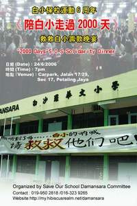 白沙罗华文小学(白小),至今已经被关闭了超过2000天。被关闭初期,政府当局的说法:学校太靠近高速大道、危险、噪音嘈杂等,事隔将近6年,已证明都是毫无根据的。至今,当地村民还是日以继夜及锲而不舍的进行着所谓“保校”的工作。虽然有关新闻都无法在主流媒体看到,但此“保校运动”却还是继续获得全国各阶层人民的支持与资助,继续开花。