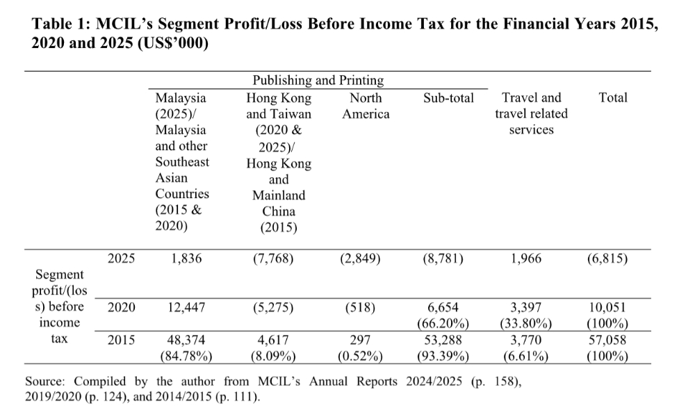 While Malaysia’s publishing and printing segment, along with the travel and travel-related services segment, delivered a combined profit before income tax of US$3.8 million (RM15 million), it was insufficient to cover the massive loss before income tax of US$8.781 million from Hong Kong and Taiwan, and North America. As a result, MCIL posted a loss before income tax of US$6.8 million.