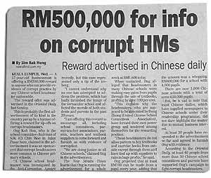 本来,部份华小校长贪污课题也是很敏感的。但是,一些华文报章开始时没有认识到这一点而大事报导,从董总和校长职工会交恶开始,到王国丰悬赏揭发贪污校长的新闻和广告见报之后,新海峡时报跟进,小事才化大。校长职工会和董总的会谈流产后,校长职工会领袖们在金马宫酒店举行记者会,发表给董总主席的公开信,信中提到“职工会强烈认为,把上述事件刊登在英文报章,已经严重打击华教未来发展,因为这将为别有居心者提供将华教连根拔起的机会。”(原文见3月4日星洲日报)