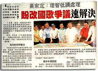 今天的《南洋商报》第三版大标题说“不能做国旗蛋糕”,《星洲日报》第八版却有马华总会长黄家定和一班高官显要齐齐用刀切国旗蛋糕的大胆照片,很有和首相署礼宾司及国际会议秘书处对着干的意味。在首相署礼宾司及国际会议秘书处看来,这班高官显要把国旗切开分吃掉,意味把自己的祖国搞到四分五裂,你一块我一块的吃掉,这罪行,恐怕不下于黄明志把国歌乱乱唱了。