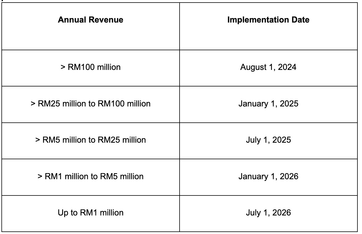 The e-Invoice implementation in Malaysia follows a phased approach based on annual revenue: