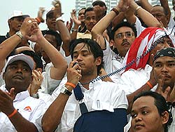 “当然,我们现在知道同人不同命,八旗子弟示威可以上头版,驸马可以闯过数道警方人墙交备忘录。但是,等待反对党和非政府组织的却是水炮车和红棍。不过,谁说八旗子弟不会示威呢?还记得当年东帝汶事件里头,已经投奔公正党的前巫青团秘书赛夫丁如何率巫青、马青、国大党青等破门而入,阻止一项“危害国家利益”的国际会议吗?这个案子不是有受害者在索赔吗?你们的总编辑与总执行长不也是当年这宗案件的受害者吗?”