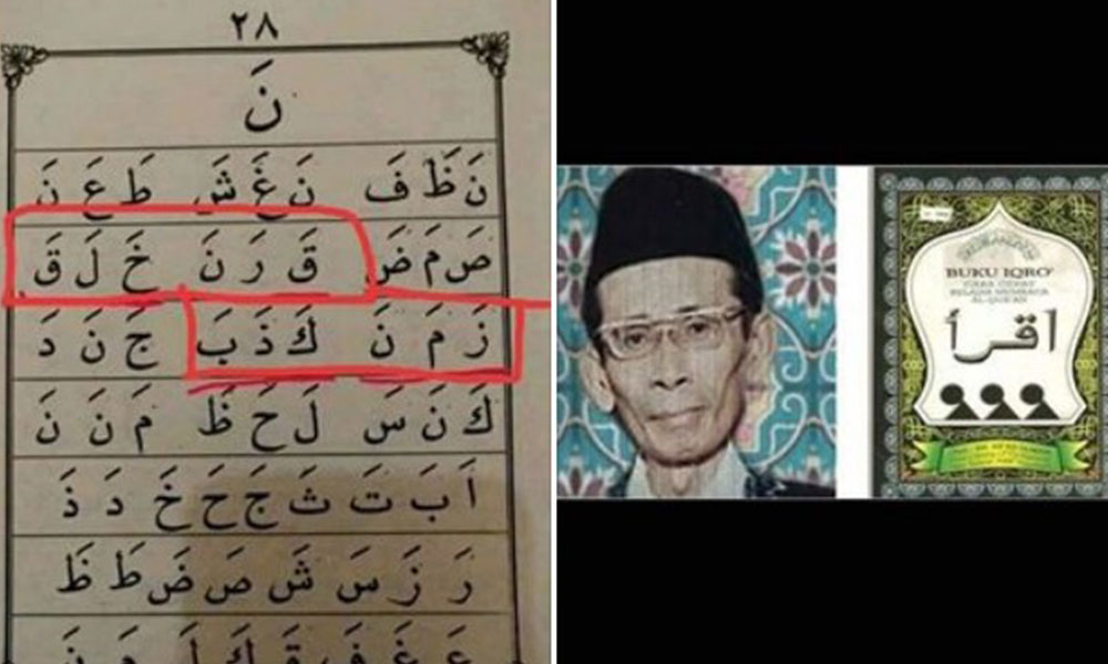 Turut mengiringi kata-kata tersebut ialah kapsyen salah satu halaman dari buku Iqra yang digariskan dengan warna merah membentuk seperti perkataan Arab iaitu qorona, kholaqo, zamana dan kazaba.