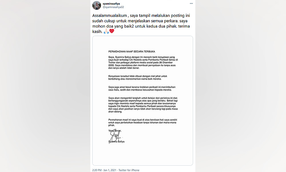 Terdahulu, Syamira dalam permohonan maafnya mengaku dia mengeluarkan dakwaan tanpa asas dan tidak benar terhadap Neelofa dan PU Riz.