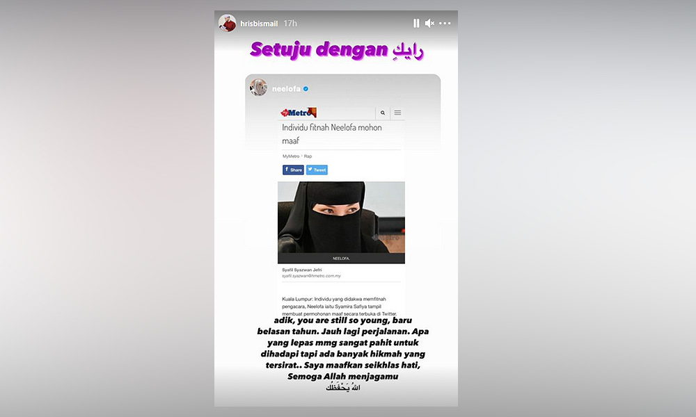 Haris atau PU Riz yang bersetuju dengan kenyataan tersebut kemudian mengulang siar kata-kata Neelofa melalui Insta Story miliknya.