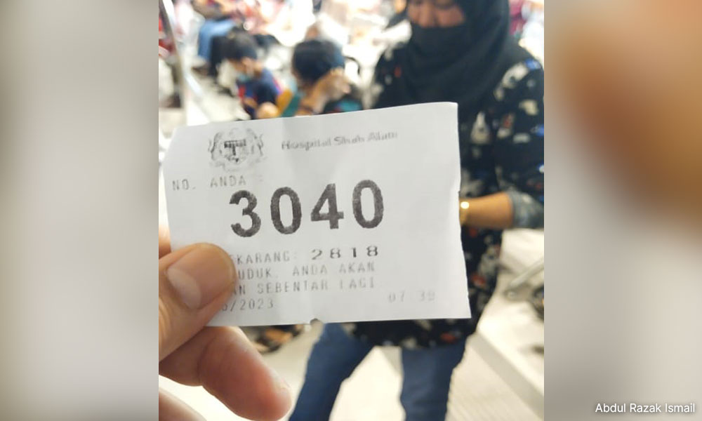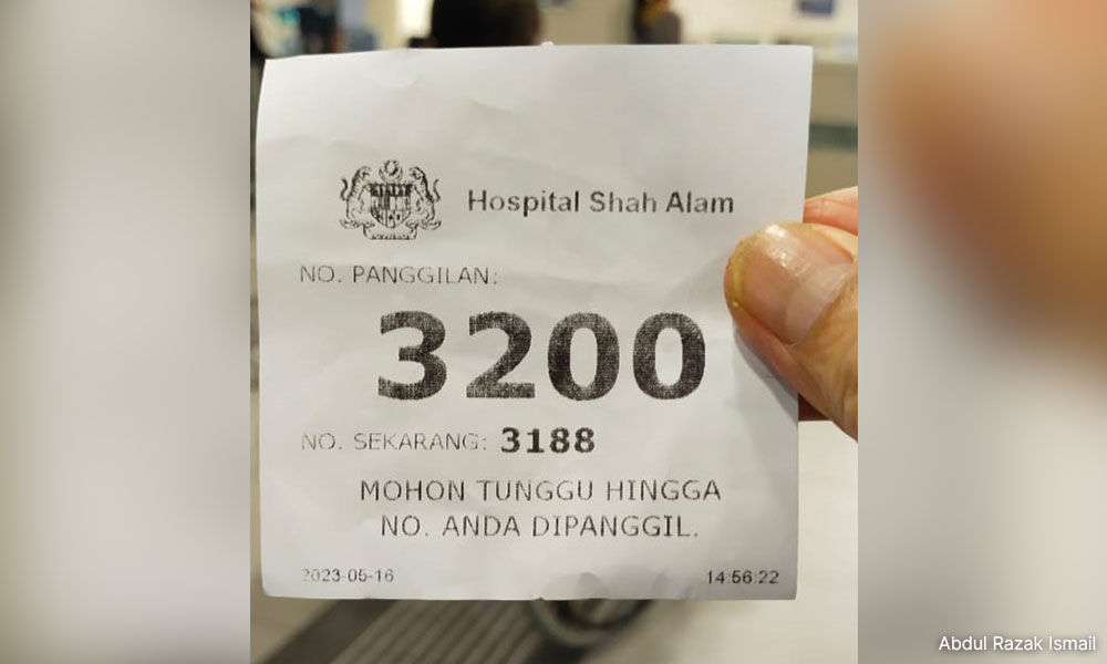 Dalam kes ibu saya, ibu saya terpaksa ambil tiga kali nombor giliran bermula lapan pagi berakhir hampir 4.30 – 5.00 petang.