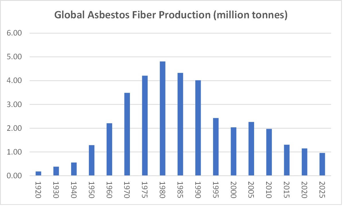 As mentioned, the global asbestos industry is in terminal decline. For the first time since 1950, global production has fallen below one million tonnes.