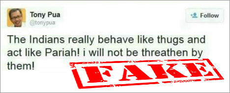 "The image of a fake racist tweet purportedly made by me that is circulating widely via WhatsApp is the amateur work of thugs," Pua said in a statement today.
