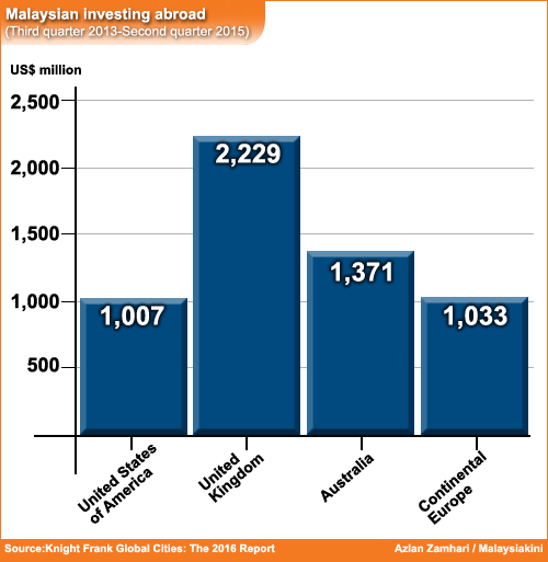 From the third quarter of 2013 until the second quarter of this year, Malaysian investments in the UK totalled US$2.23 billion (RM9.75 billion), Australia (US$1.37 billion, or RM5.99 billion), continental Europe (US$1.03 billion or RM4.50 billion ), and US (US$1.01 billion or RM4.41 billion).