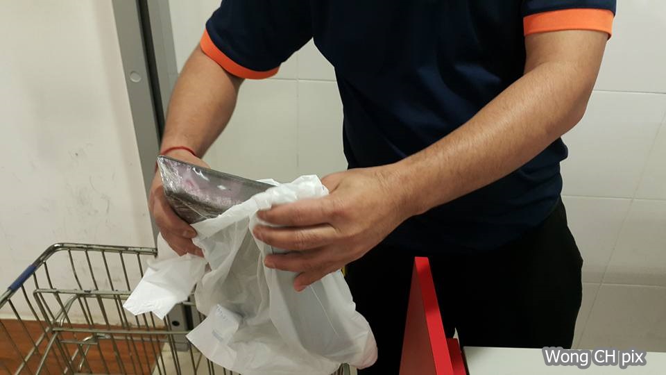 Gambar kemudian menunjukkan jurujual membalut tulang babinya dengan sebuah beg plastik.