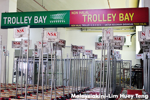 Tetapi troli halal dan tidak halal di pasar raya NSK itu kini tidak membezakan warna. Sebaliknya troli tidak halal dilabelkan dengan papan tanda "non-halal" sebaliknya troli halal tidak diletakkan sebarang label.