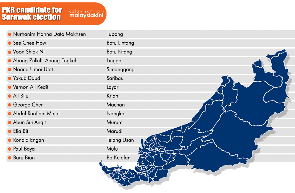 They are Nurhanim Hanna Dato Mokhsen, who is to contest in Tupong, See Chee How (Batu Lintang), Voon Shiak Ni (Batu Kitang), Abg Zulkifli Abg Engkeh (Lingga), Norina Umoi Utot (Simanggang), Yakub Daud (Saribas), Vernon Aji Kedit (Layar), Ali Biju (Kerian), George Chen (Machan), Abdul Raafidin Majid (Nangka), Abun Sui Angit (Murum), Elia Bit (Marudi), Ronald Engan (Telang Usan), Paul Baya (Mulu) and Baru Bian (Ba’Kelalan).