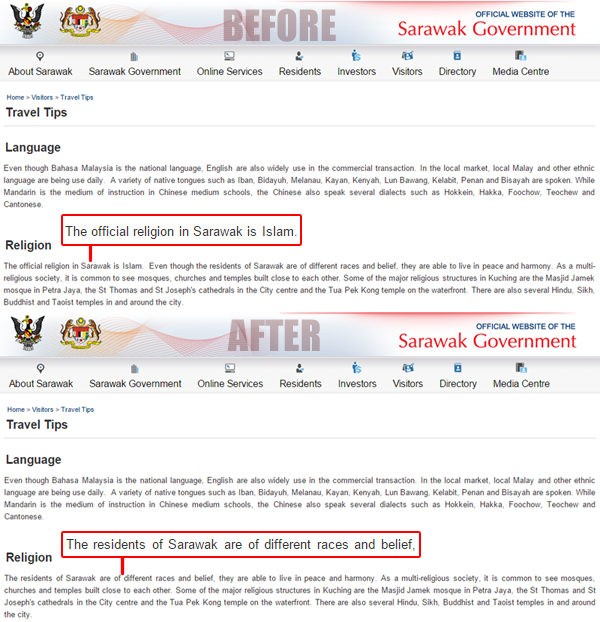 “Perlembagaan negeri Sarawak adalah jelas - Sarawak tidak mempunyai agama rasmi, tetapi laman web negeri (sebelum ini) menyatakan sebaliknya,” katanya.