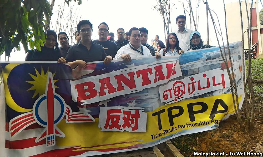 They carry placards with the words "Tolak TPPA" and "TPPA is selling country".