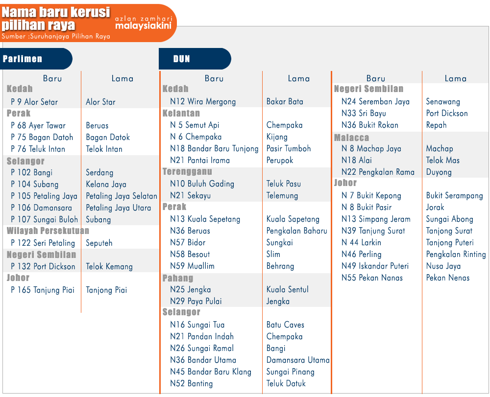 Bawah cadangan itu, keseluruhan 12 kerusi parlimen dan 36 kerusi Dewan Undangan Negeri (DUN) dicadangkan ditukar nama.