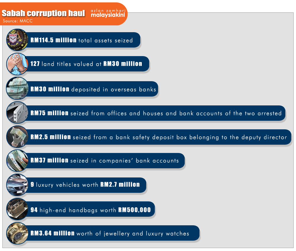 On Oct 4, MACC detained the director and deputy director of a government department here and seized RM114.5 million from them, for alleged abuse of power involving the infrastructure projects.