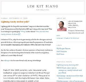 大马政坛宿将林吉祥和沙里尔分别加入部落客(Blog)行列,于今年设立本身的部落格,为本地政坛开创新格局。预料这样的潮流,能够提高年轻网民的政治参与,政治人物更可以通过部落格争取年轻选民的支持。