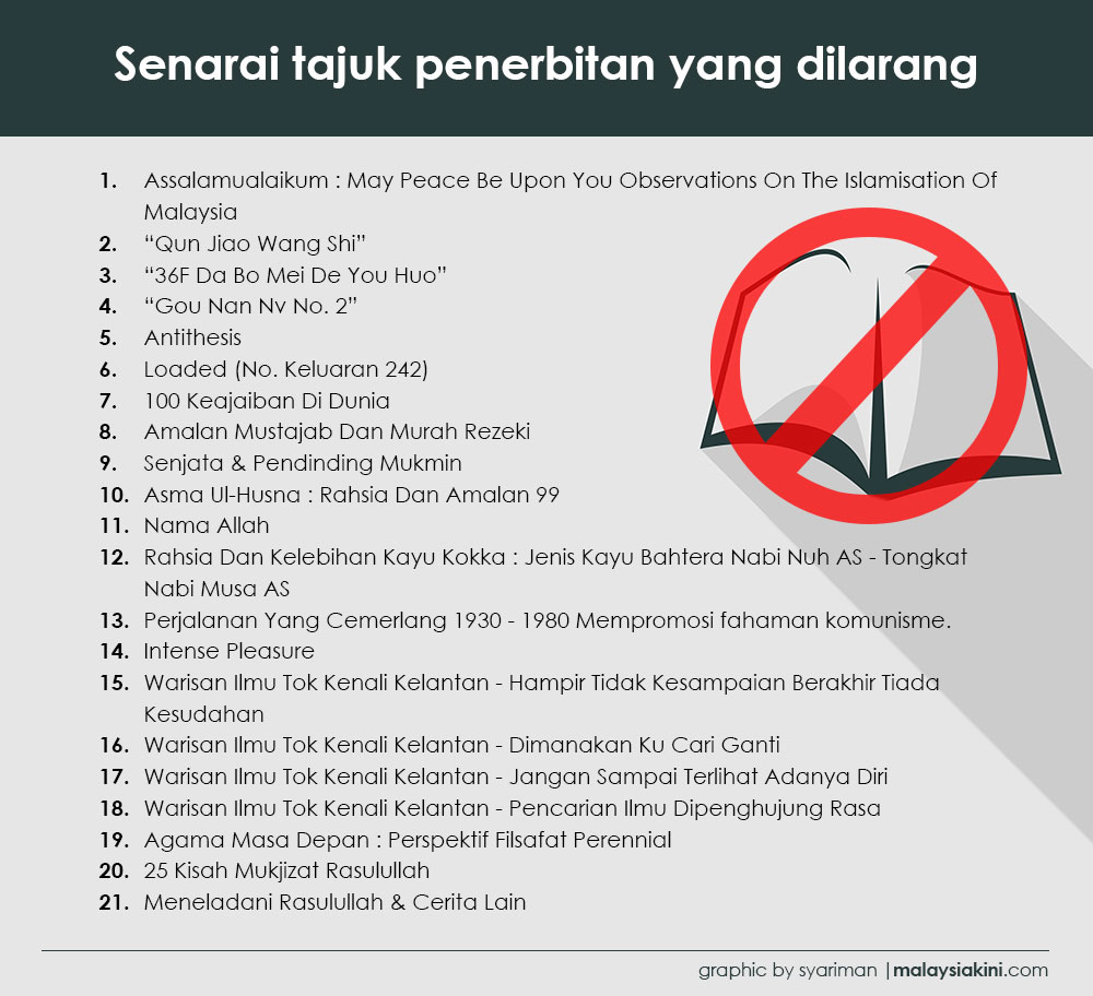 Kementerian Dalam Negeri (KDN) mewartakan perintah larangan terhadap 21 penerbitan kerana kandungannya yang mungkin memudaratkan keselamatan, ketenteraman, moral dan kepentingan awam serta menggemparkan fikiran orang ramai.