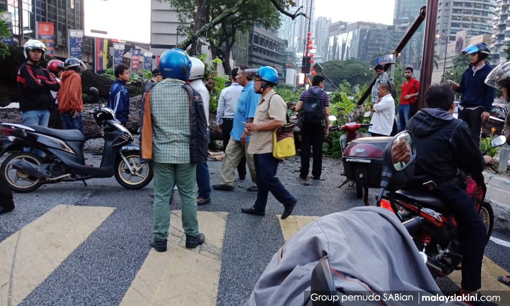 Seorang penunggang motosikal dan pemboncengnya cedera selepas dihempap sebatang pokok tumbang di Jalan Ampang berhampiran Menara Berkembar Petronas, KLCC di Kuala Lumpur hari ini.
