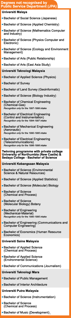 不受承认的学位包括马大的科学学士学位(应用化学)、社会科学学士学位(东亚研究)、工大的科学学士学位(生物工业)、化学工程学士学位(化学-天然气)、国大的工程学士学位(传播与电脑工程)、理大的大众传播学士学位(新闻)、玛拉工艺大学的公共行政学士学位、博大的音乐学士学位等。