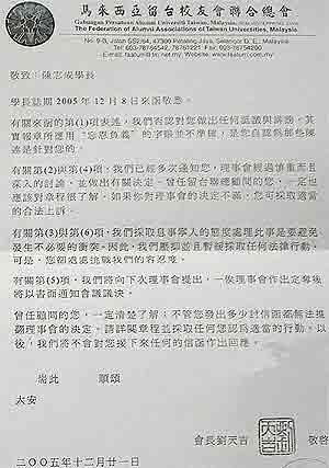 “我已经写好了律师信,但是再三思考后,还是下不了手,留台联总还是一个好组织,只是它的几个理事不对,应该将他们撤换掉。”