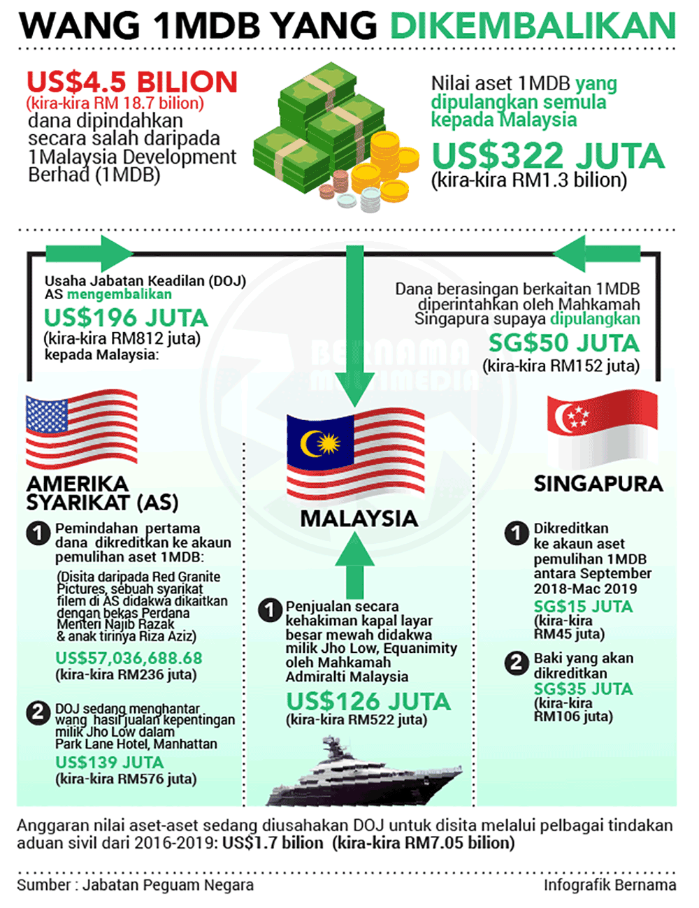 Jabatan Peguam Negara memaklumkan sejumlah AS$322 juta (RM1.3 bilion) daripada aset-aset 1MDB dapat dikembalikan ke Malaysia berikutan Inisiatif Pemulihan Aset Kleptokrasi oleh Jabatan Keadilan (DOJ) Amerika Syarikat.