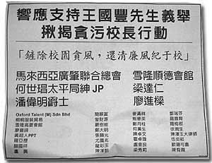 这则半版的广告刊登于《东方日报》A12版,大标题为“响应支持王国丰先生义举,揪揭贪污校长行动”,副题为“铲除校园贪风,还清廉风纪于校”。