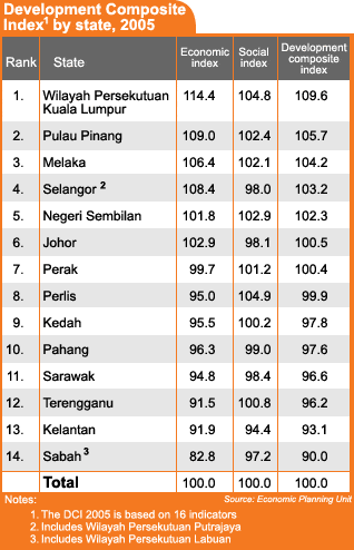 半岛中部地区在2005年获得最高的发展指数,其中包括马六甲、森美兰和吉隆坡。