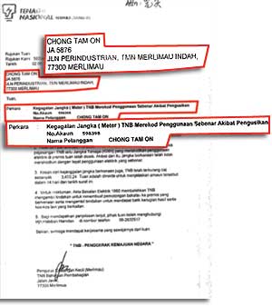 该份志期2006年6月2日的通知信由万里望(Merlimau)国能分局经理所签署,收信人为马华望万区州议员钟谭安。通知信指国能的技术人员在今年5月26日的检查中发现钟谭安的住家盗电,“国能拥有确凿证据,证明由国能安装,以记录您住家的电力使用率的电表,已经遭人动手脚”。