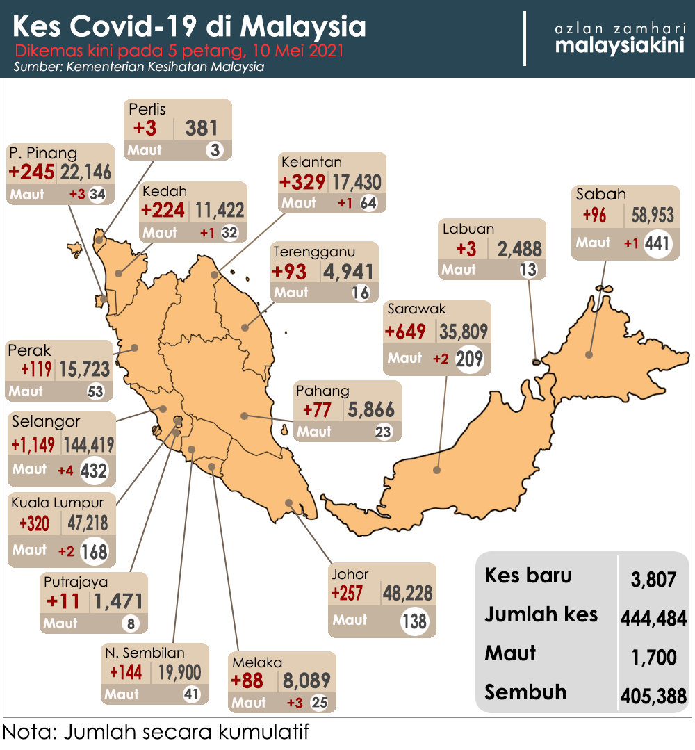 Kementerian Kesihatan Malaysia (KKM) hari ini melaporkan 3,807 kes baru berbanding, 3,733 kes Covid-19 yang dicatatakan semalam. Jumlah itu kembali meningkat berbanding tiga hari lalu yang melebihi 4,000 kes.